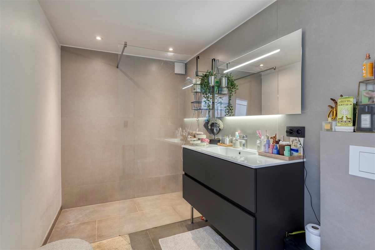 Badkamer 1 (Gelijkvloers)6.77 m2 (Uitgerust met een toilet, een ééndelige lavabomeubel en een inloopdouche.)