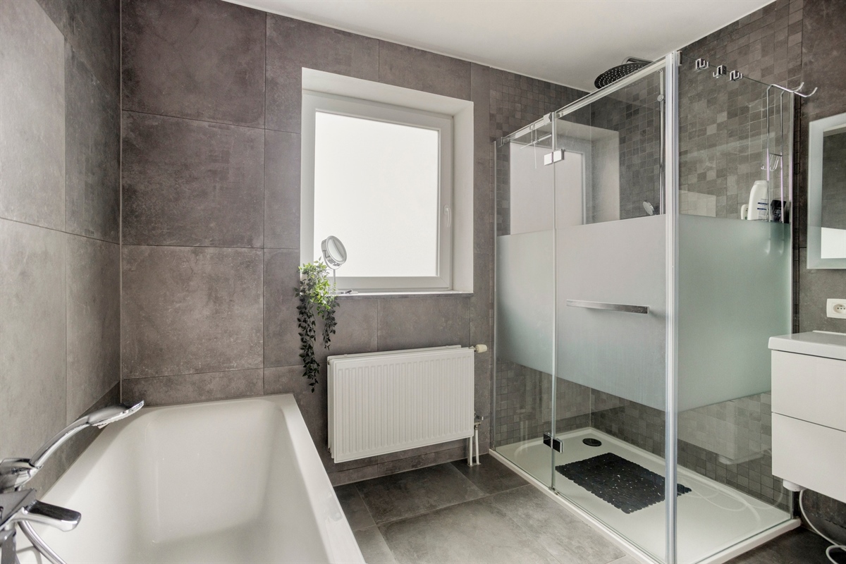 Badkamer 1 (Eerste verdieping)7.84 m2 (uitgerust met een ligbad, een douche, een toilet en een lavabokast)