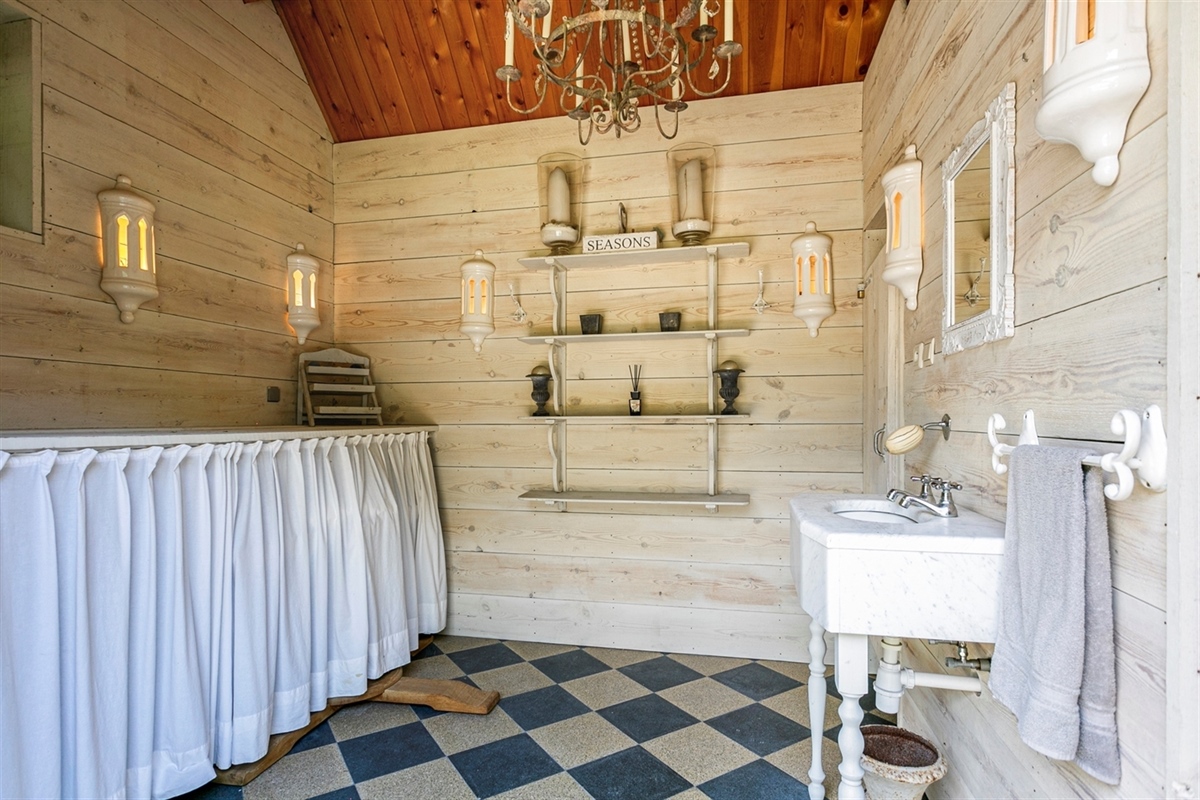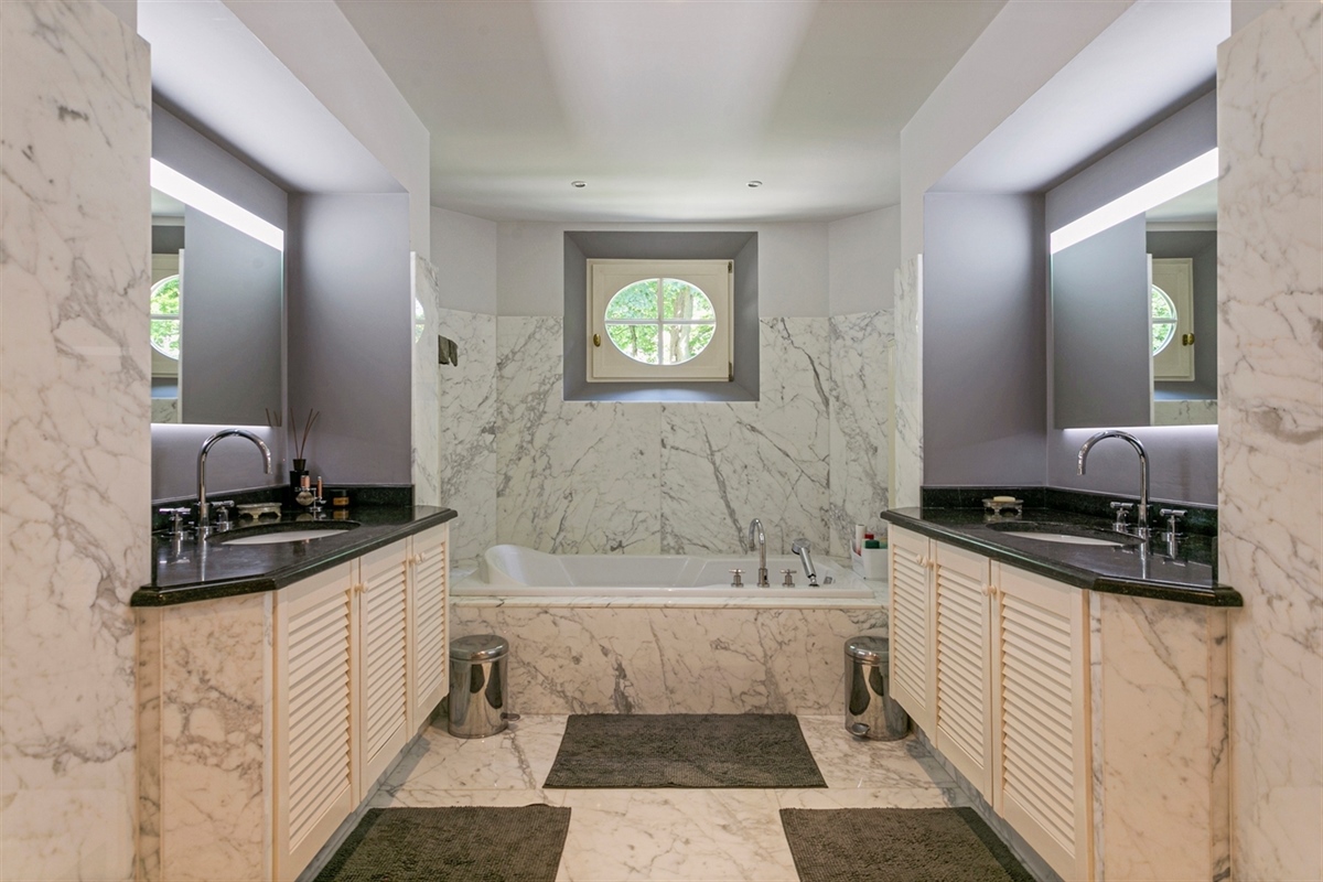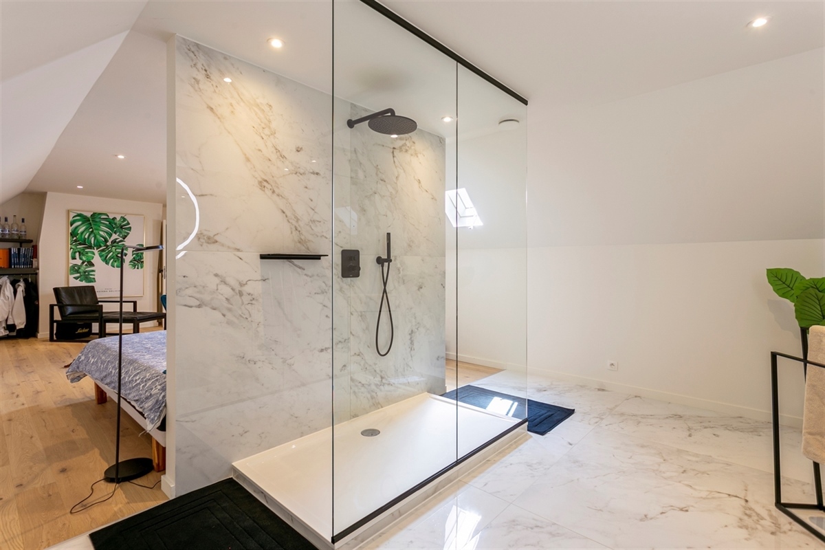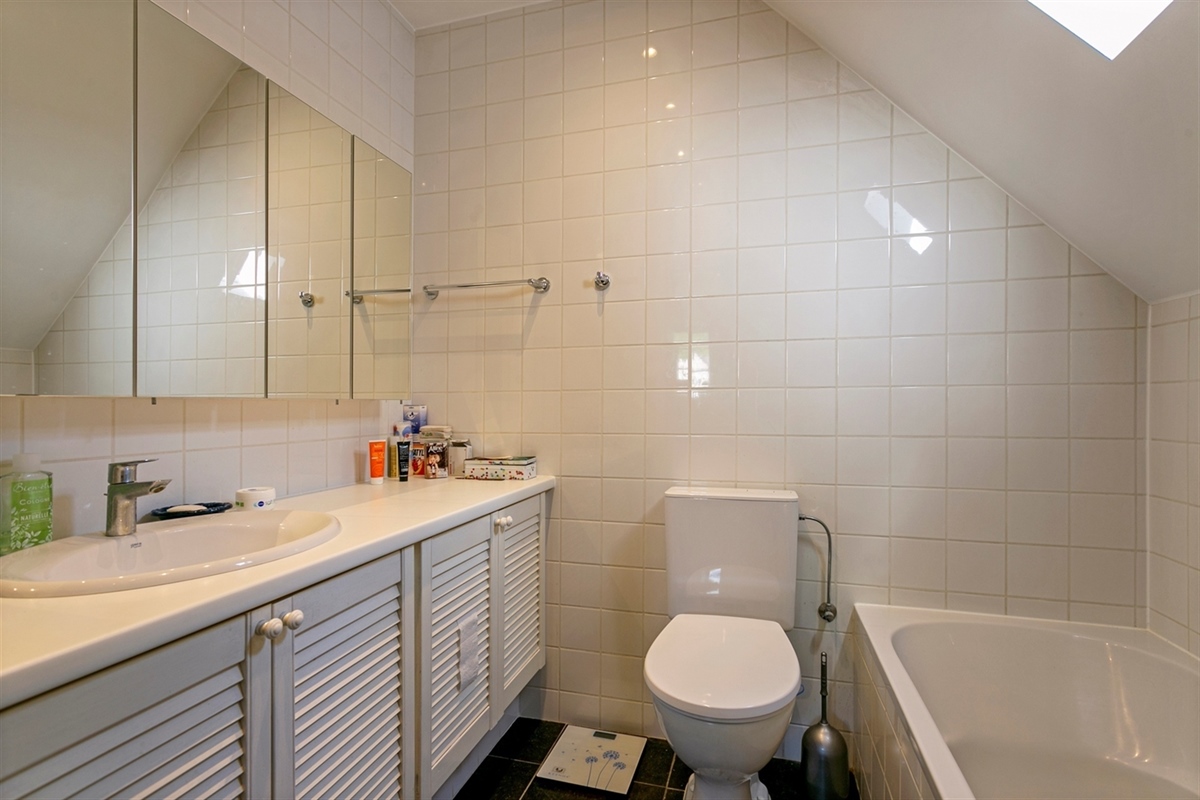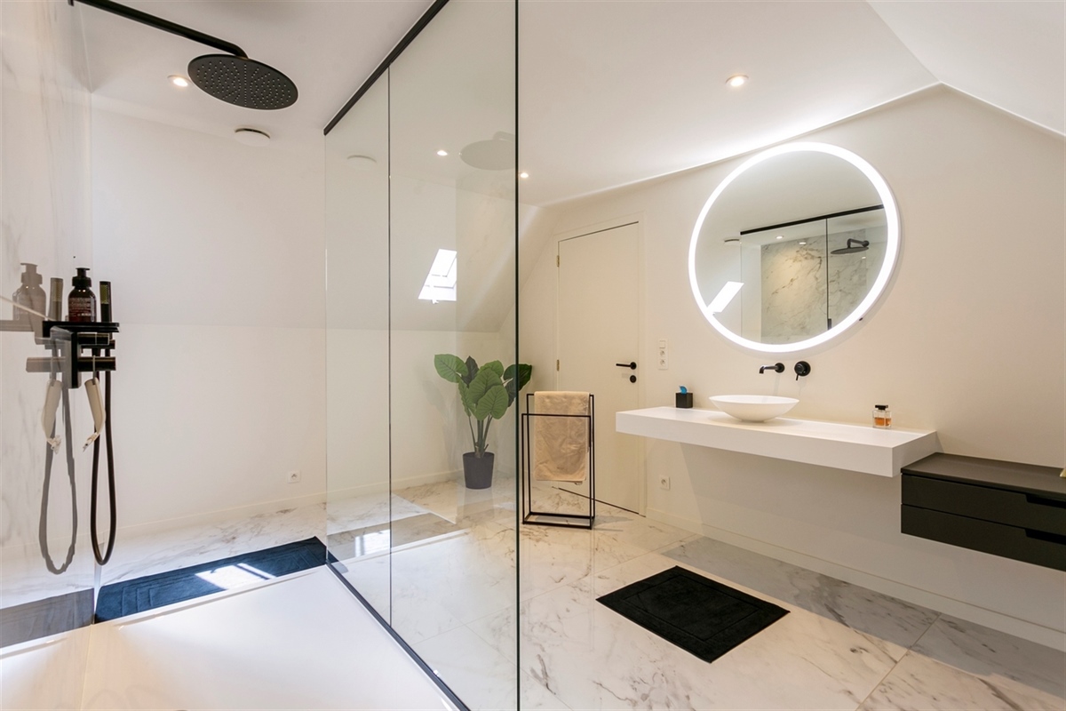 Badkamer 1 (Eerste verdieping)8.28 m2 (uitgerust met een dubbele lavabokast, , een ligbad, een inloopdouche en een toilet)