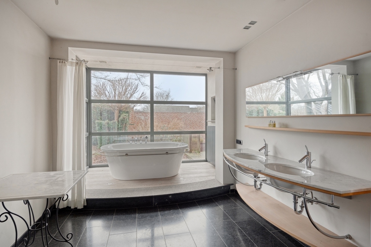 Badkamer 1 (Gelijkvloers)16.84 m2 (Henegouwse blauwe steen, uitgerust met een ligbad, een douche, een toilet en een dubbele lavabokast)