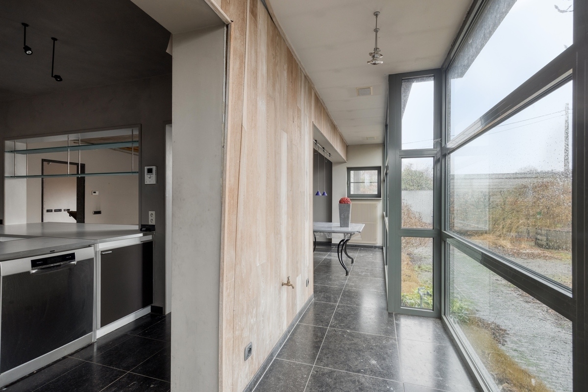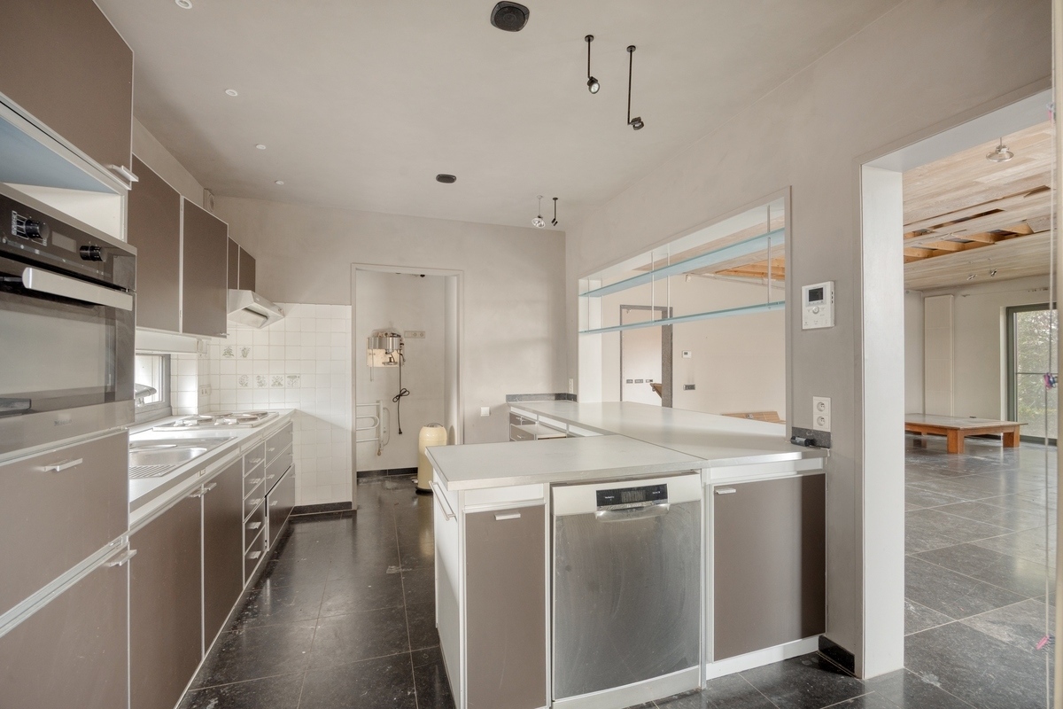 Keuken (Gelijkvloers)11.64 m2 (Henegouwse blauwe steen, ingericht met een elektrisch kookfornuis, een dampkap, een spoelbak, een inbouw combioven, vaatwasmachine en koelkast)