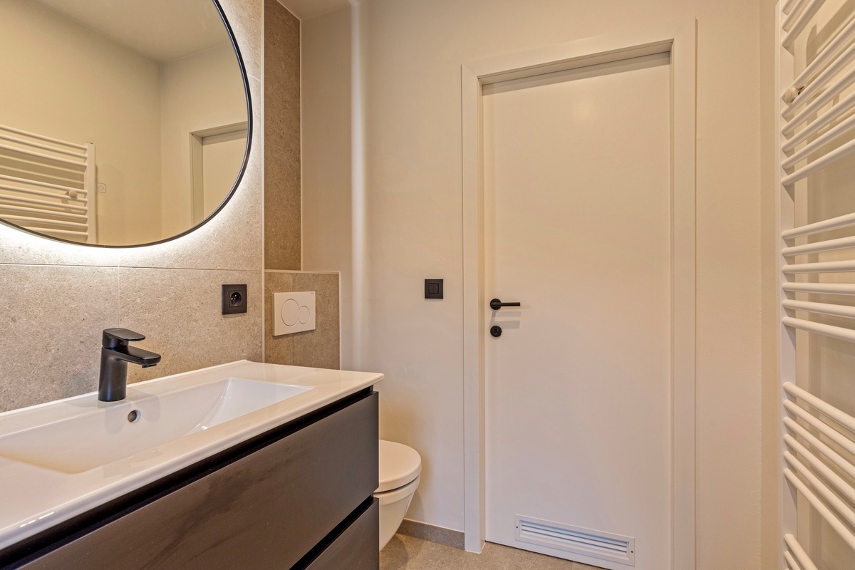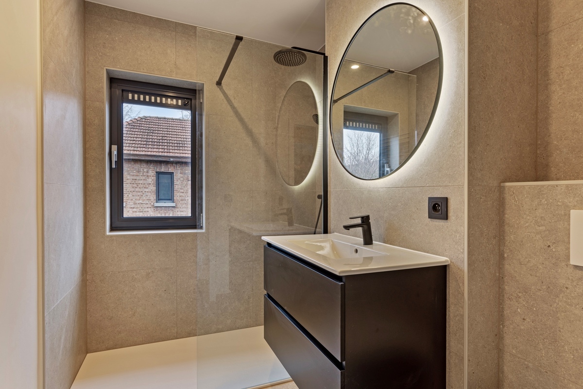 Badkamer 1 (Eerste verdieping)4.61 m2 (uitgerust met een wastafelkast, een inloopdouche en een hangtoilet)